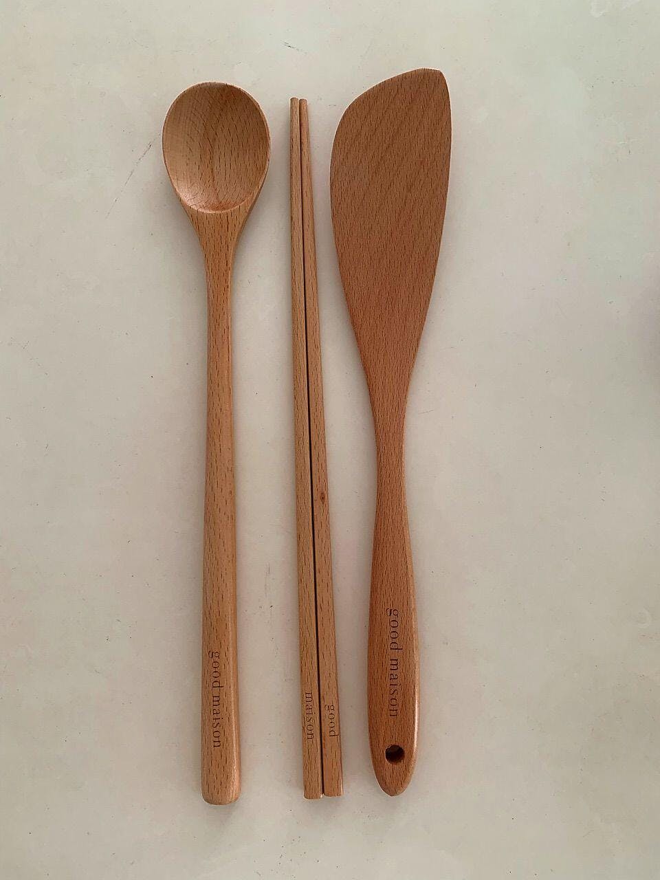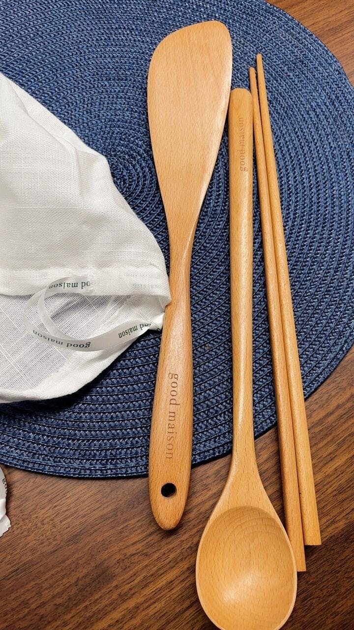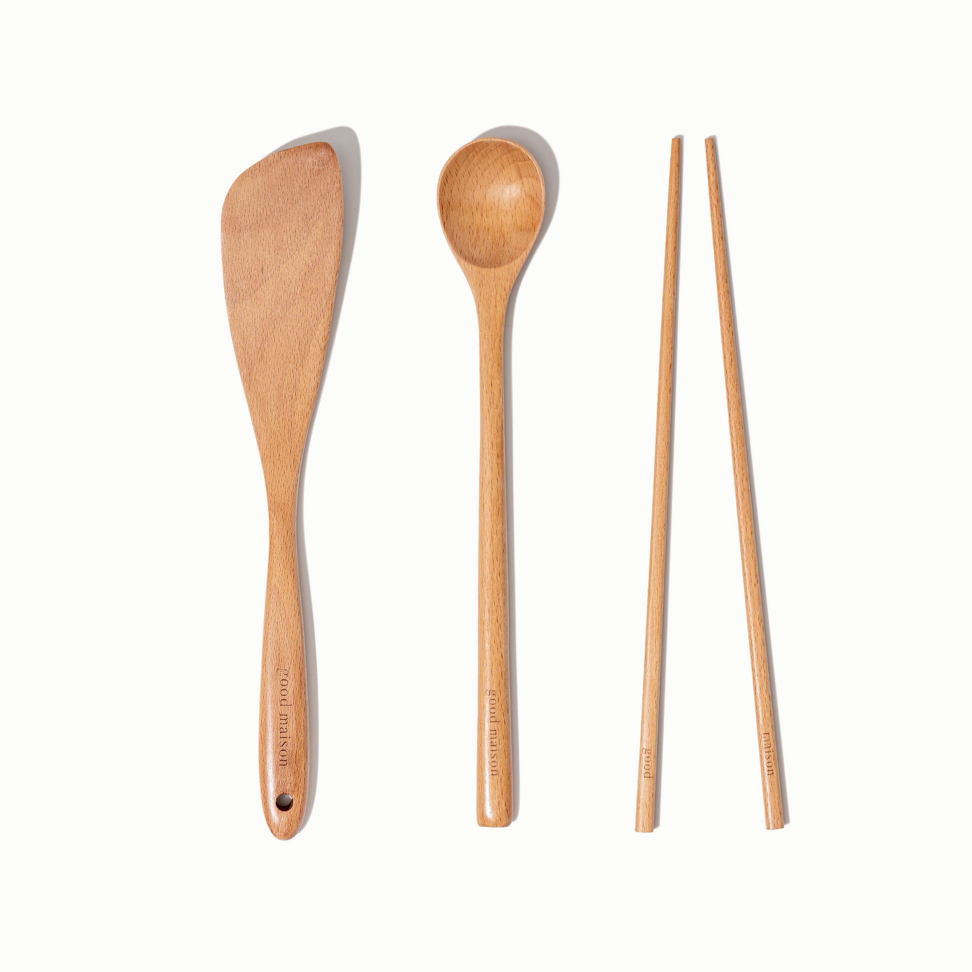 Solid Beech Wood Angled Spatula, Long Chopsticks and Long Spoon: Handcrafted from Food-safe Beech hardwood.
